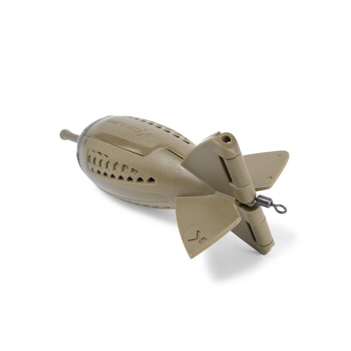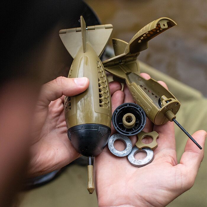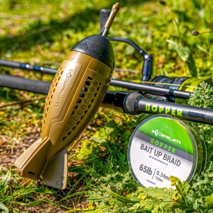 Дословно — капельница для прикормки. Боппер Korum оснащен уникальной системой, в которой можно использовать сменные груза для регулировки скорости погружения и веса. Данную ракету можно использовать как с утяжелителями так и без них. Полость для них скрыта внутри носового обтекателя. Основной груз имеет конусную форму, дополнительные в виде шайб с центральным отверстием. Груза надеваются на центральную направляющую с резьбой расположенную в носовой части и фиксируются стопорной гайкой. Данная система позволяет регулировать вес прикормочной ракеты в зависимости от скорости течения реки. Благодаря аэродинамичной форме, сопротивление в воздухе и воде минимально, а оперение в хвостовой части создаёт стабилизацию полёта и влияет на точность прикармливания. Корпус состоит из двух не симметричных частей, большая из которых предназначена для загрузки прикормки. Обе части имеют отверстия позволяющие легко и быстро извлекать ракету из воды. Части подпружиненны и открываются когда Боппер ударяется о дно озера или реки. Центральный подвижный штифт из нержавеющей стали предназначен для запирания секции после загрузки и открытия для сброса прикормки. Существует два размера Bopper для различных условий, и каждая версия может использоваться с грузами или без них, если потребуется. Возможность утяжелять его при прикармливании в зависимости от скорости течения, меняет правила игры, и несомненно подойдет многим любителям фидерной ловли на реках. Стандартная версия поставляется с базовым грузом 30 гр и двумя дополнительными такого же веса. Версия XL поставляется с базовым грузом 60 гр и тремя дополнительными по 30 гр. Для работы с данными прикормочными ракетами в ассортименте компании Korum есть специальное удилище Bopper Baiting Up 10 футов 5,5 лб и плетёный шнур Bait Up Braid 65 либров.